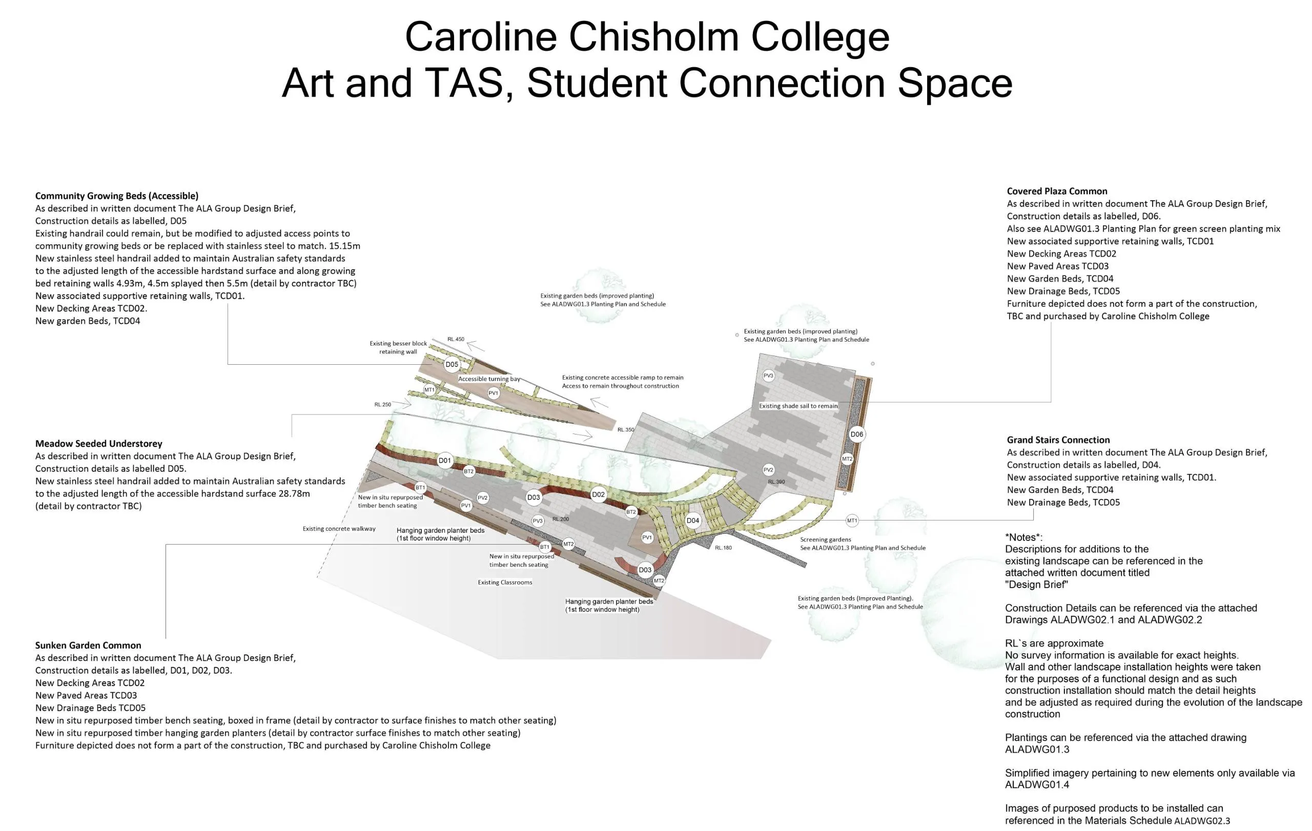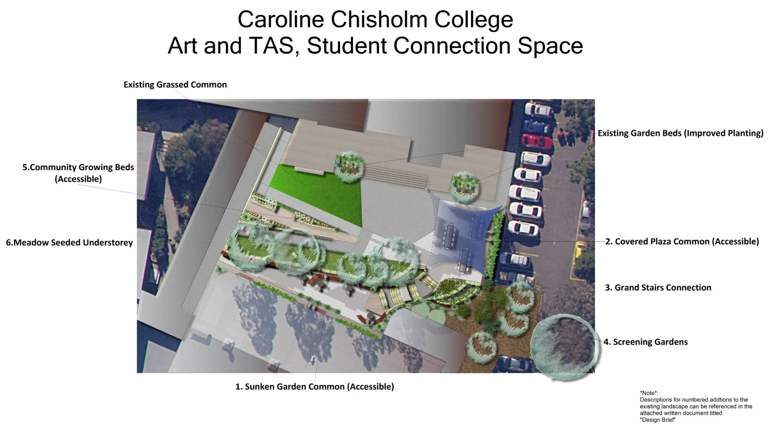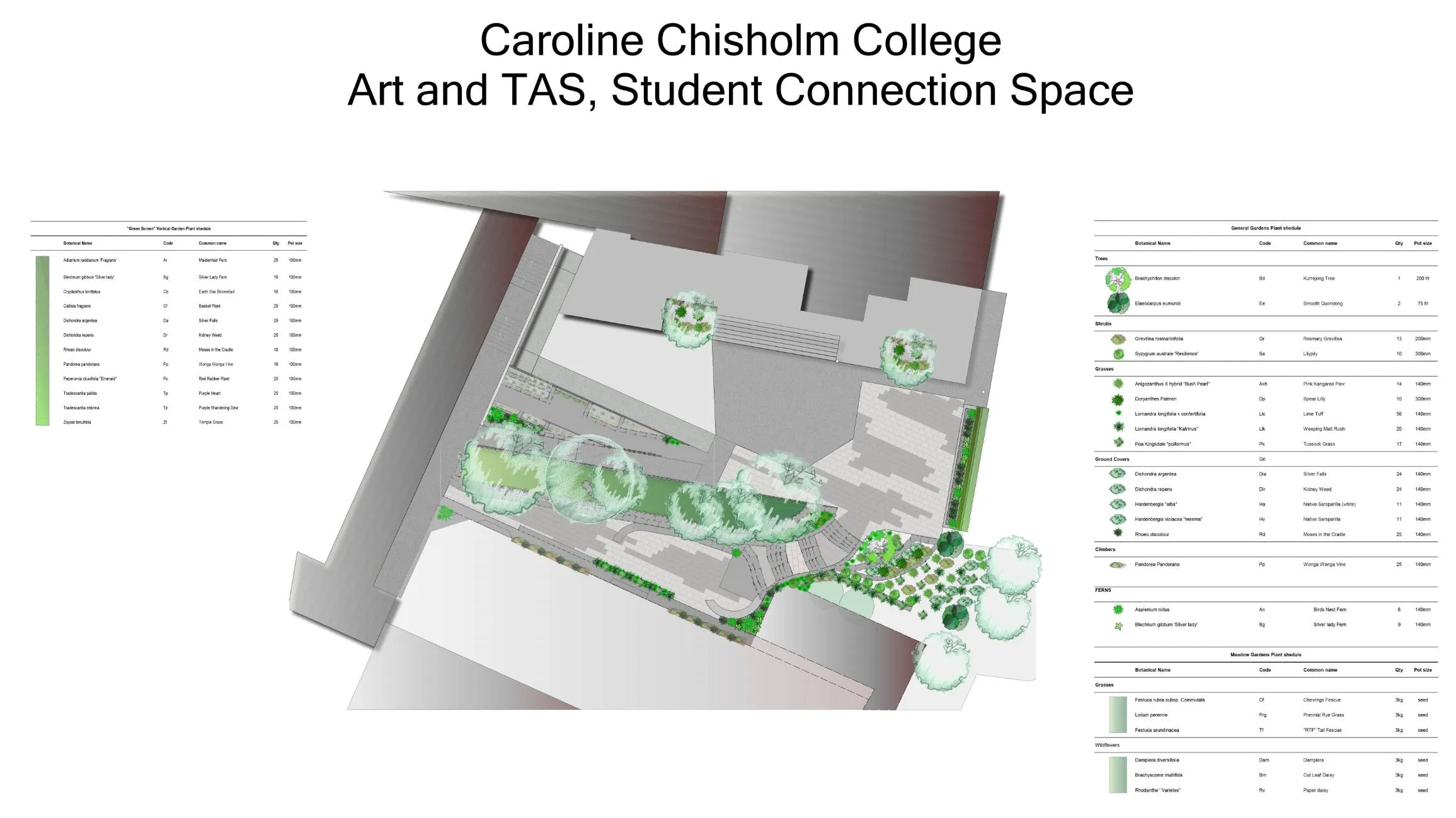 This standout concept blends function and native beauty for a large school campus. CWC Signature Landscapes designed a flowing layout with walkways, layered garden beds, and custom ironwork that enhances movement and visual interest.